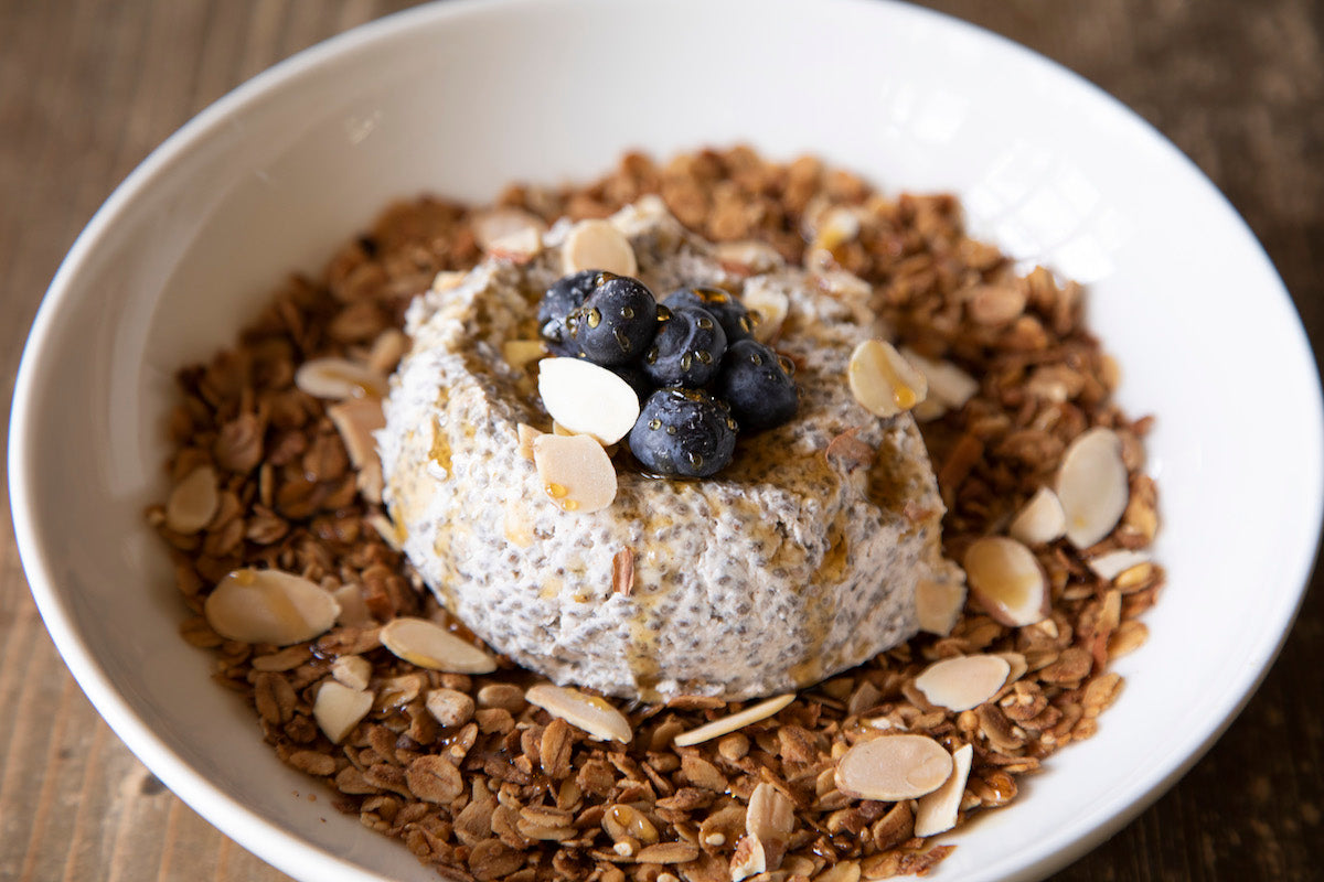The Power Bowl is an exciting addition to our All-Day Breakfast line-up. This vegan breakfast bowl packs a protein punch. Made with vanilla coconut milk chia pudding, fresh blueberries, vegan granola, and toasted almonds, it offers a hearty, healthy start for your morning.